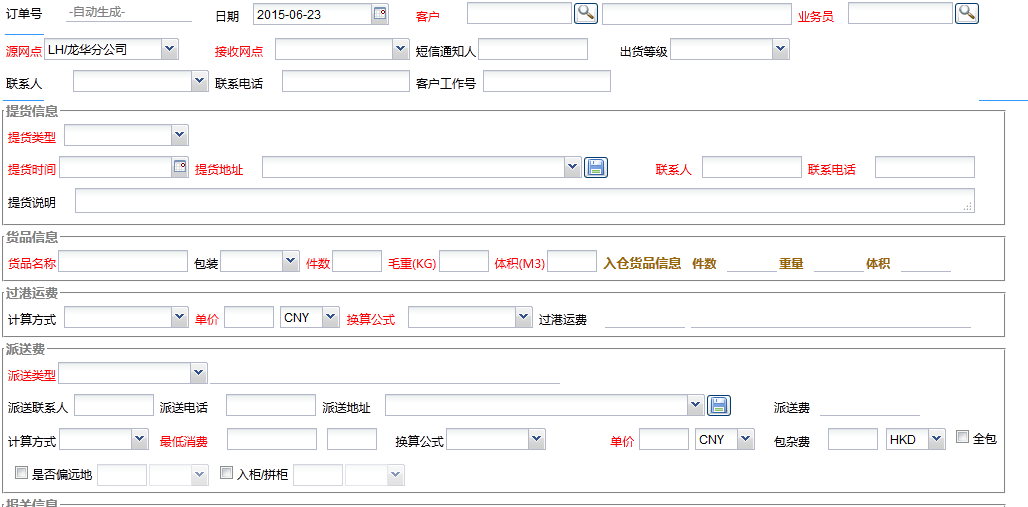 首先客戶有貨下港,我們首先確認客戶客戶的報關方式,是快件還是一般貿易出口;確定了這個我們就會進入我們erp系統的新增訂單頁面。向客戶了解到產品是什么,以及貨物信息,包括件數重量體積,同時問道客戶的提貨具體地址,以及到工廠時間,這樣我們就完成上門提貨這個環節調度安排好提貨司機。緊接著中港運費報價也隨貨量也隨貨物入倉而相應產生。過港費用生成欄后面是香港派送倉庫類型選擇,收貨詳細地址,聯系人電話填寫,填好這些相應的派送數據費用也相應產生,當中雜費實報實銷和全包兩個選項。派送欄完成了,尾紙是有需要寄送欄勾選。